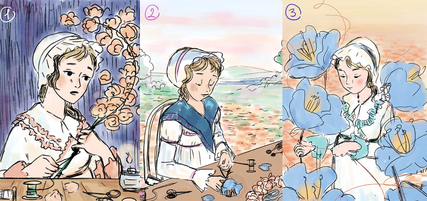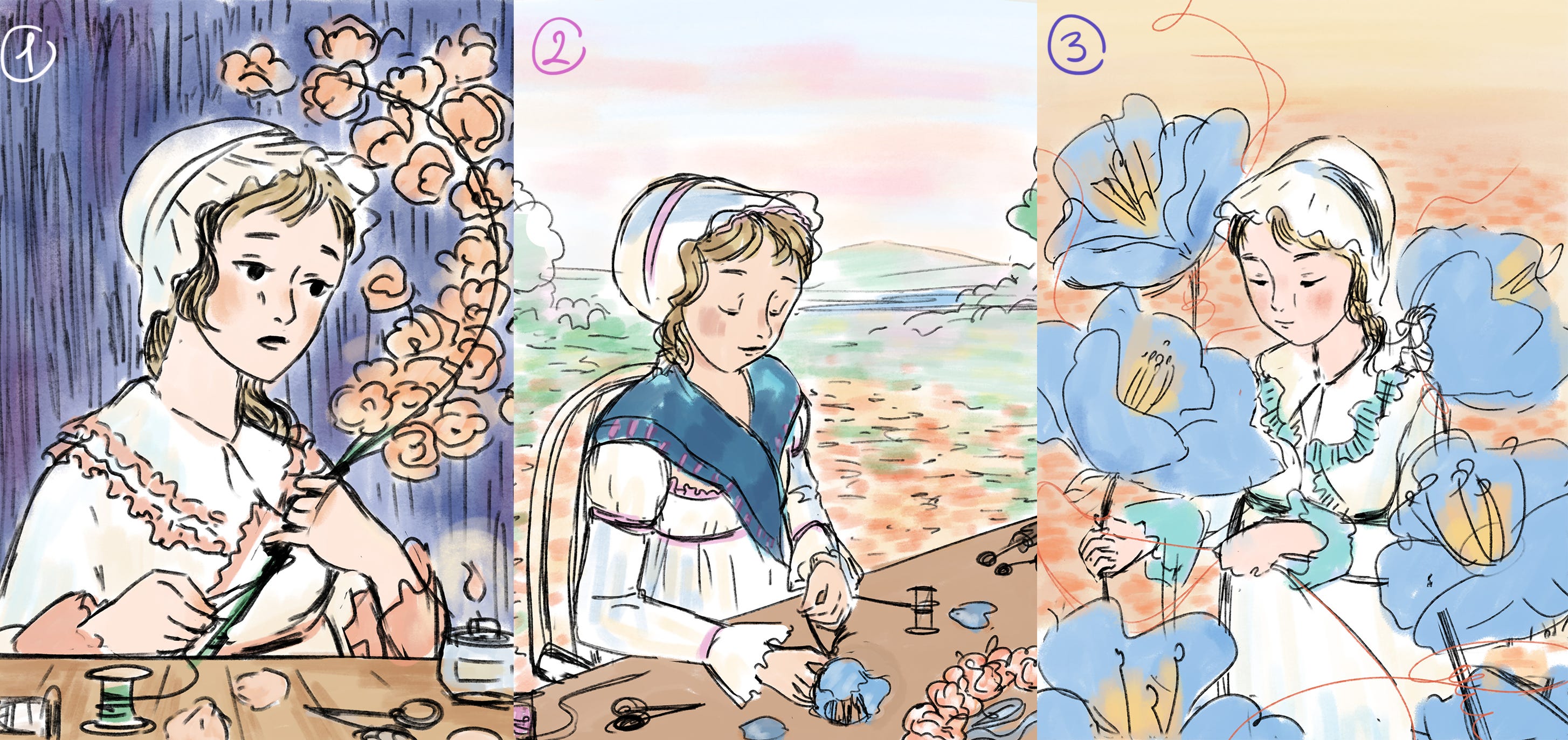 So, when it comes to the cover, you have to figure out on your own what details and part of the story you want to reveal to the reader. There is no text to guide you in this decision, so you probably want to come up with more than one sketch. An important aspect is the emotional one: what feeling do you want the reader to have when seeing the cover? Do you want them to be amused, frightened, or nostalgic? In my case, the story would suggest me to go for a gentle, romantic atmosphere. This will also influence the color palette: a dark scene with harsh shadows would suggest mistery, while pastel, light colors and soft shadows are more appropriate for a quiet scene. So with all these aspects in mind, I couldn’t decide whether to represent a part of the story or create something more abstract. In the end, I opted for the main character doing her thing, aka composing silk blue poppies.